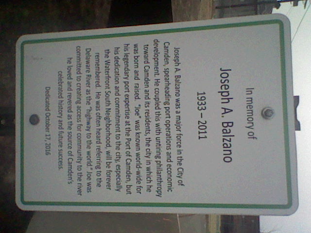 Joseph A. Balzano was a major force in the City of Camden, spearheading port operations and economic development. He coupled this with untiring philanthropy toward Camden and its residents, the city in which he was born and raised. "Joe" was known world-wide for his legendary port expertise at the Port of Camden, but his dedication and commitment to the city, especially the Waterfront South Neighborhood, will be forever remembered. He was often heard referring to the Delaware River as the "highway to the world." Joe was committed to creating access for community to the river he loved and revered as the source of Camden's celebrated history and future success.
