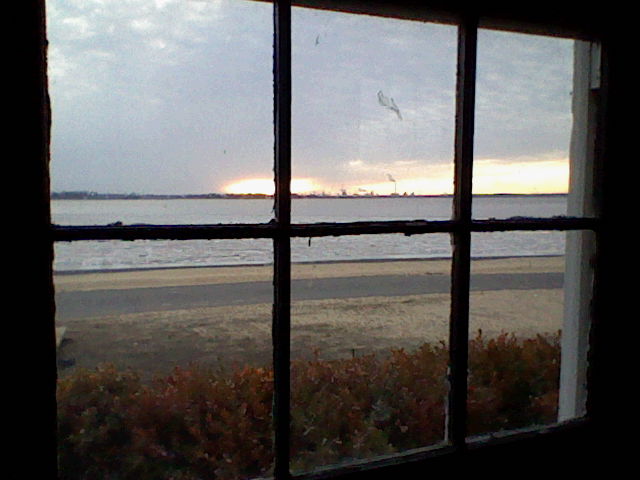 Nearby on land was a small shed. To my shock, it was actually unlocked, and that's where this picture was taken from. There was a table, some metal folding chairs, and even some space heaters and electrical outlets. To get from the shed to the end of the pier was a good few minute long walk, so I didn’t want to spend too much time in there. I wanted to see the SS United States as she rounded the corner. So every once in a while, I’d hide in the shed for 10 or 15 minutes to warm up a bit. If not for that shed, I might have gotten frostbite. I have a vague memory of telling someone about the shed and that it was unlocked. Something is telling me it was Anne Marie or Carol, because I remember being very friendly and comfortable with this person as if I’d met them before. I actually told a few people about the shed, but this one sticks out in my mind. One guy was there before me, but he left not long after, assuming that he must have missed the SS United States. It was at the time of this picture that I realized something special was about to happen. The sun was setting, and the sky had begun to take on a delightful orange hue. I can see some great sunsets from my house, so I have a pretty good idea of how quickly and drastically they change. I hoped desperately that the SS United States would pass us during the best part of the sunset.